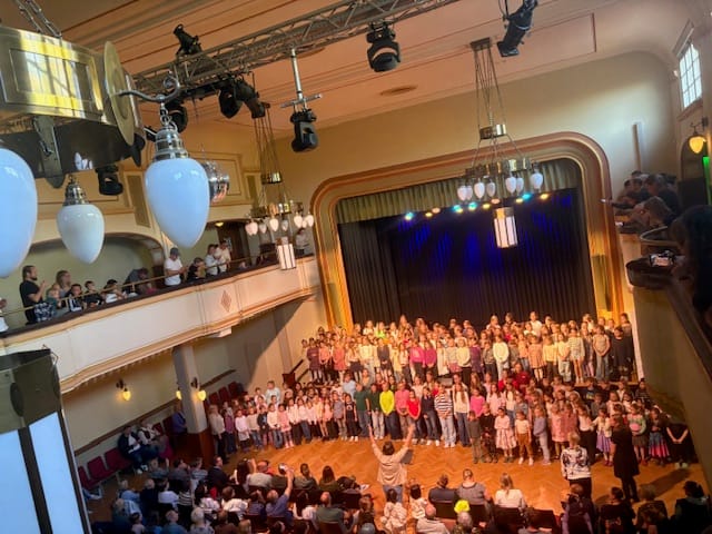 Die Kinder der 3. und 4. Klassen unseres Schulchores sangen die Titel „Eine kleine Welle“ von Uli Führe und den bewegenden Song „Die Eule fühlt den Beat“. Zum Finale erklangen rund 130 Stimmen gemeinsam und sangen im Kanon. Mit der Botschaft des letzten Songs „Wir sprechen eine Sprache und sind alle gleich“ wurden alle Mitwirkende mit tosendem Applaus belohnt.